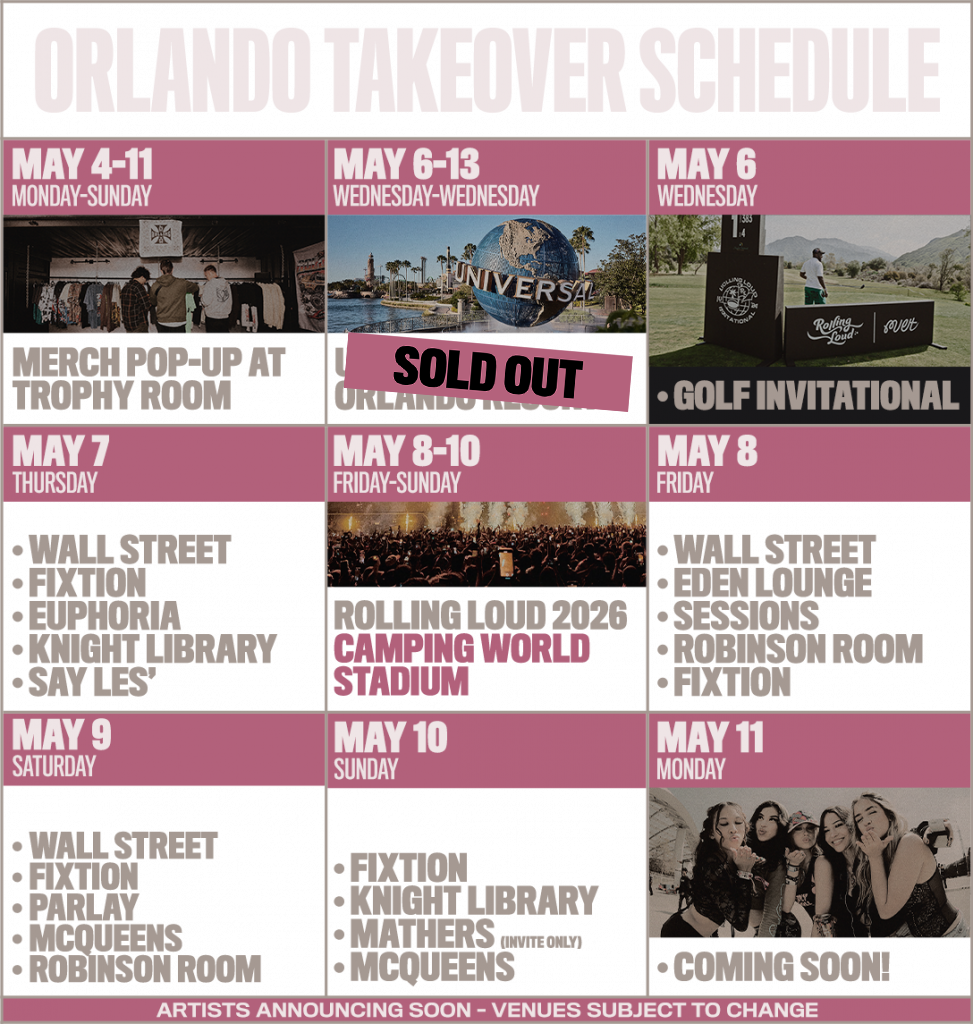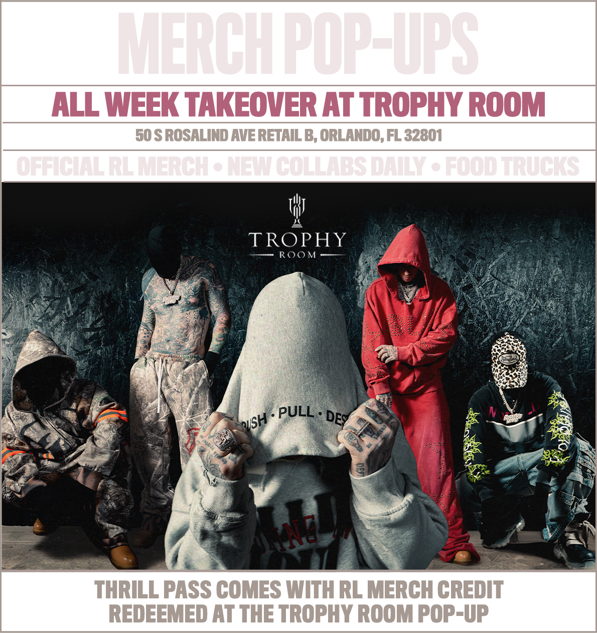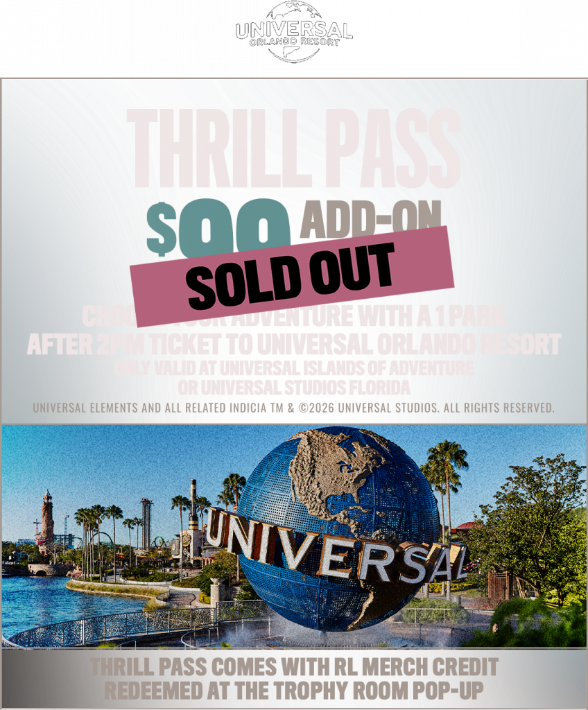 Thrill Pass and $25 shop credit must be picked up at the Trophy Room merch pop-up. Show your order number to exchange for the Thrill Pass. Merch credit can only be used on Rolling Loud Official Merchandise.